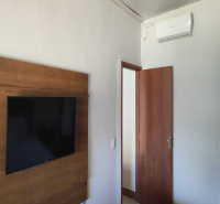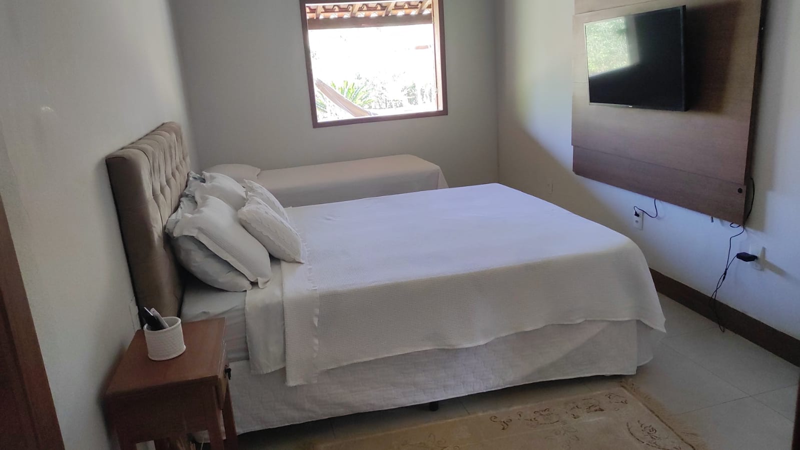Quarto 1 => Suíte com 1 cama box Queem e 1 cama box solteiro, ventilador de teto e ar condicionado.